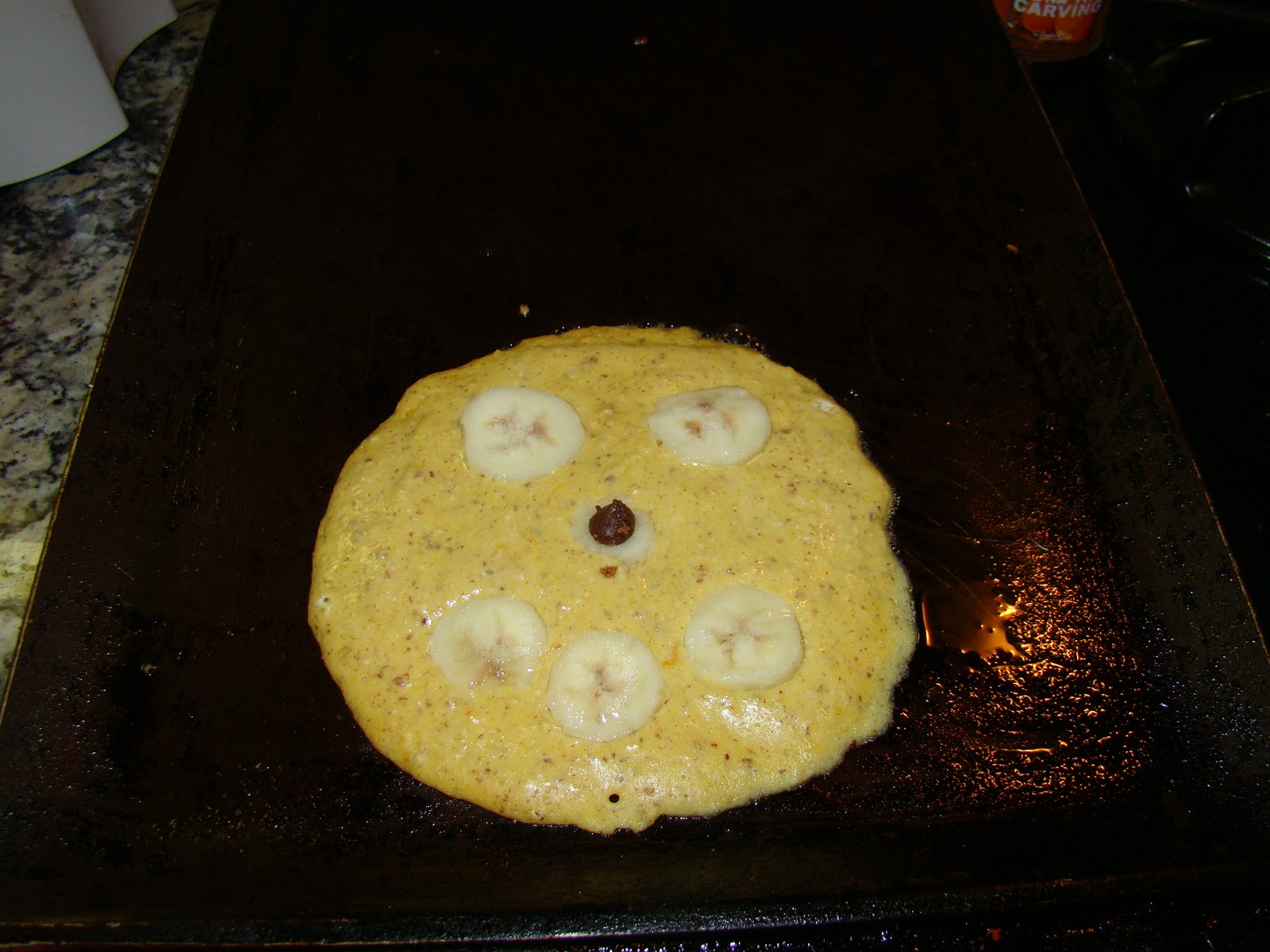 I coated the pan with more coconut oil and cooked on “3” (medium low) for 3 minutes on each side. This makes about 12 pancakes, but I held about a cup of batter back, put in a (greased) loaf pan, added chocolate chips, and voila: